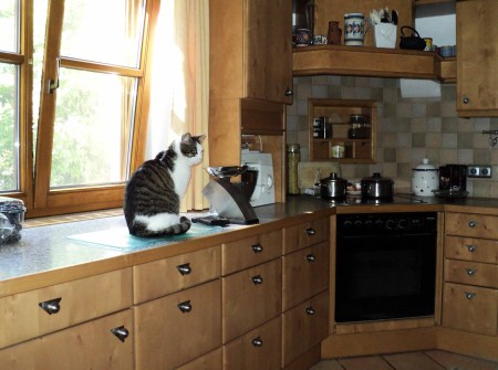 As I hardly use any cleaning agents except vinegar, alcohol, baking soda, and occasionally abrasive cleaners (Bon Ami or similar products containing feldspar), my kitchen is not completely free from any germs and does for sure not meet the standards of the aseptic area in a hospital. I have also to admit that the level of hygiene in my household is defined by my cats, which have their own idea about cleanliness (I wouldn’t go so far to say that they have a more leisurely attitude towards hygiene, they clean themselves all the time, but nevertheless they see things and do things different as we humans).