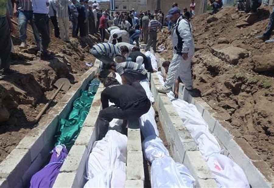 Syria’s news agency SANA reported that the atrocity was committed by opposition death squads and al-Qaeda-linked terrorist groups who also struck in the village al-Shoumarieh where crops, houses and the hospital were burnt down.