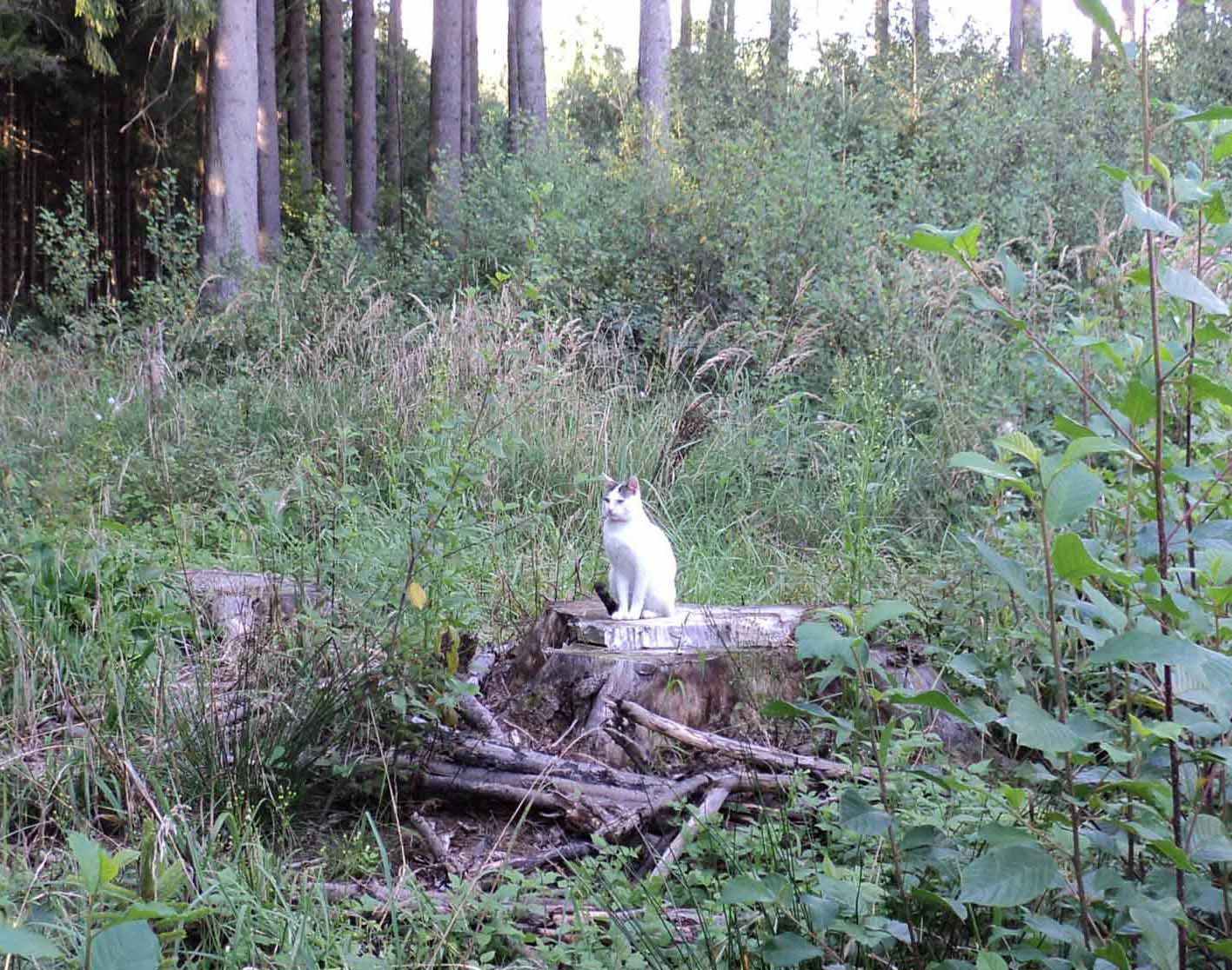Gandhi always wore a flea collar, and because of that I concluded the he was well cared for by his human hosts. One neighbor told me that Gandhi’s host family doesn’t let him into the house in summer, which would explain why he is all the time in the woods. Like Cindy, Gandhi is a forest cat, but his main whereabouts is a barn of the tree nursery on the southern edge of the forest. The barn has open as well as closed sections, and a cat like Gandhi has no problems to find a gap through which he can slip into the closed sections to spend some time there undisturbed and unthreatened.
