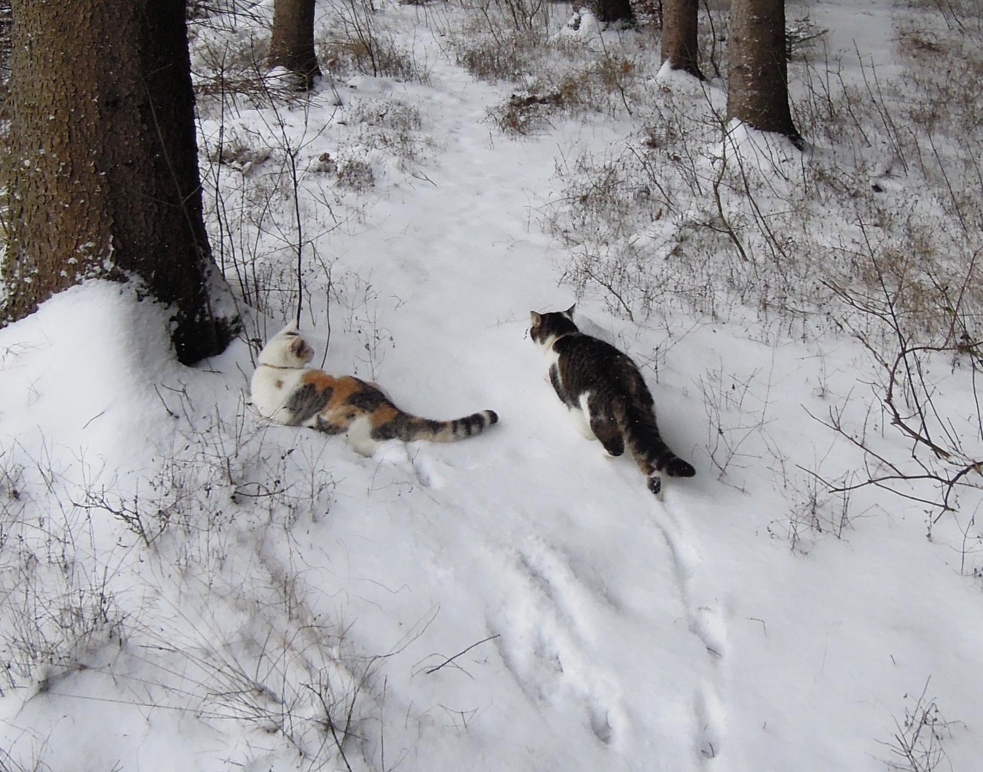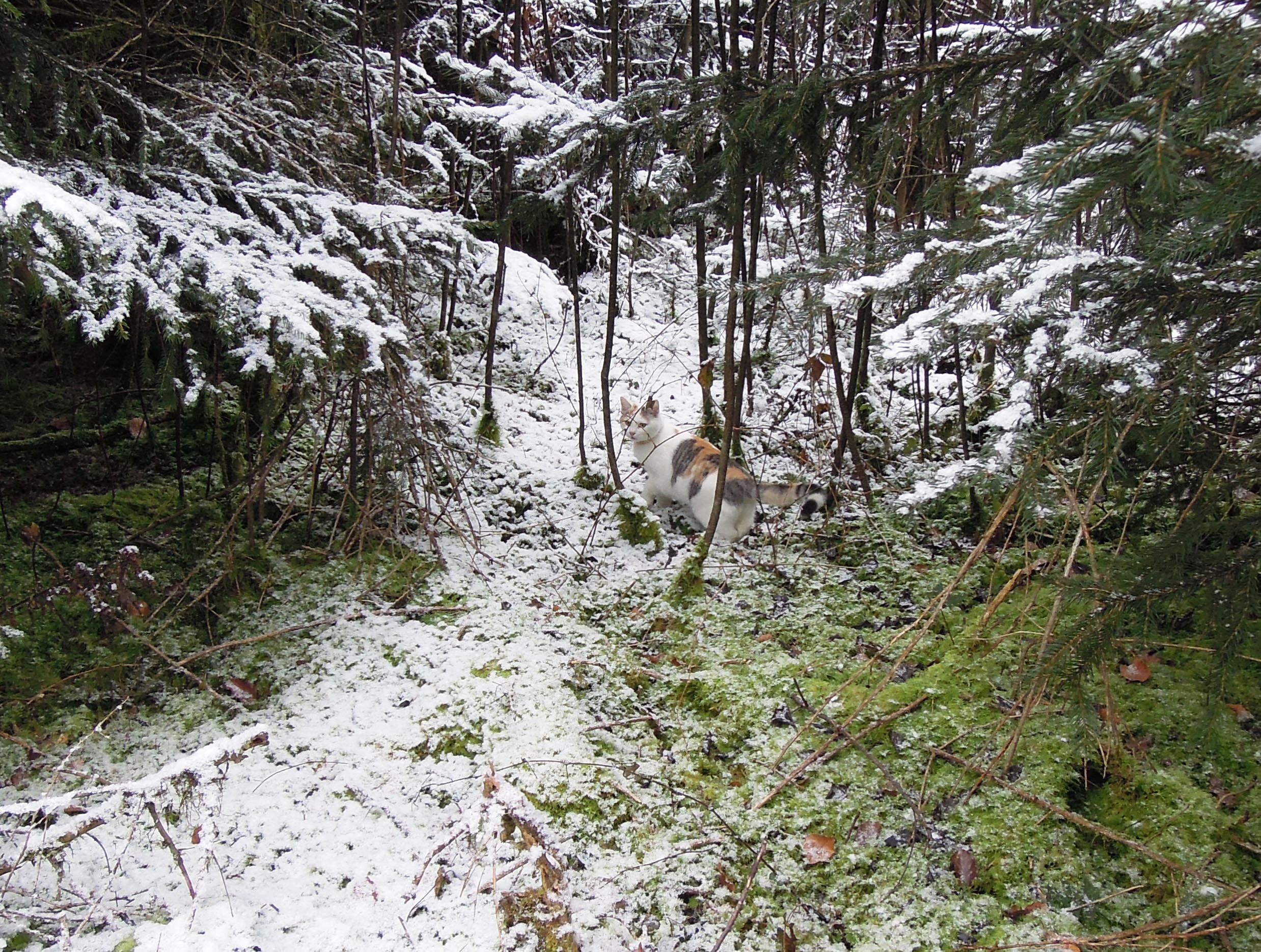 I still continue the daily walk with my feline companions in the forest but most of the cats prefer to stay in the house, they are lazy and rather lay around the wood stove.