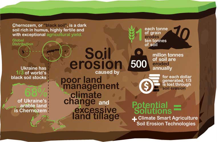 Soil erosion is a problem and over the last decades, chernozem soil across the country has been increasingly degraded by poor land management and industrial agriculture. This process is accelerating. It is estimated that over 500 million tons of soil are eroded annually from arable land in Ukraine, resulting in a loss of fertility in over 32 million hectares of soil.