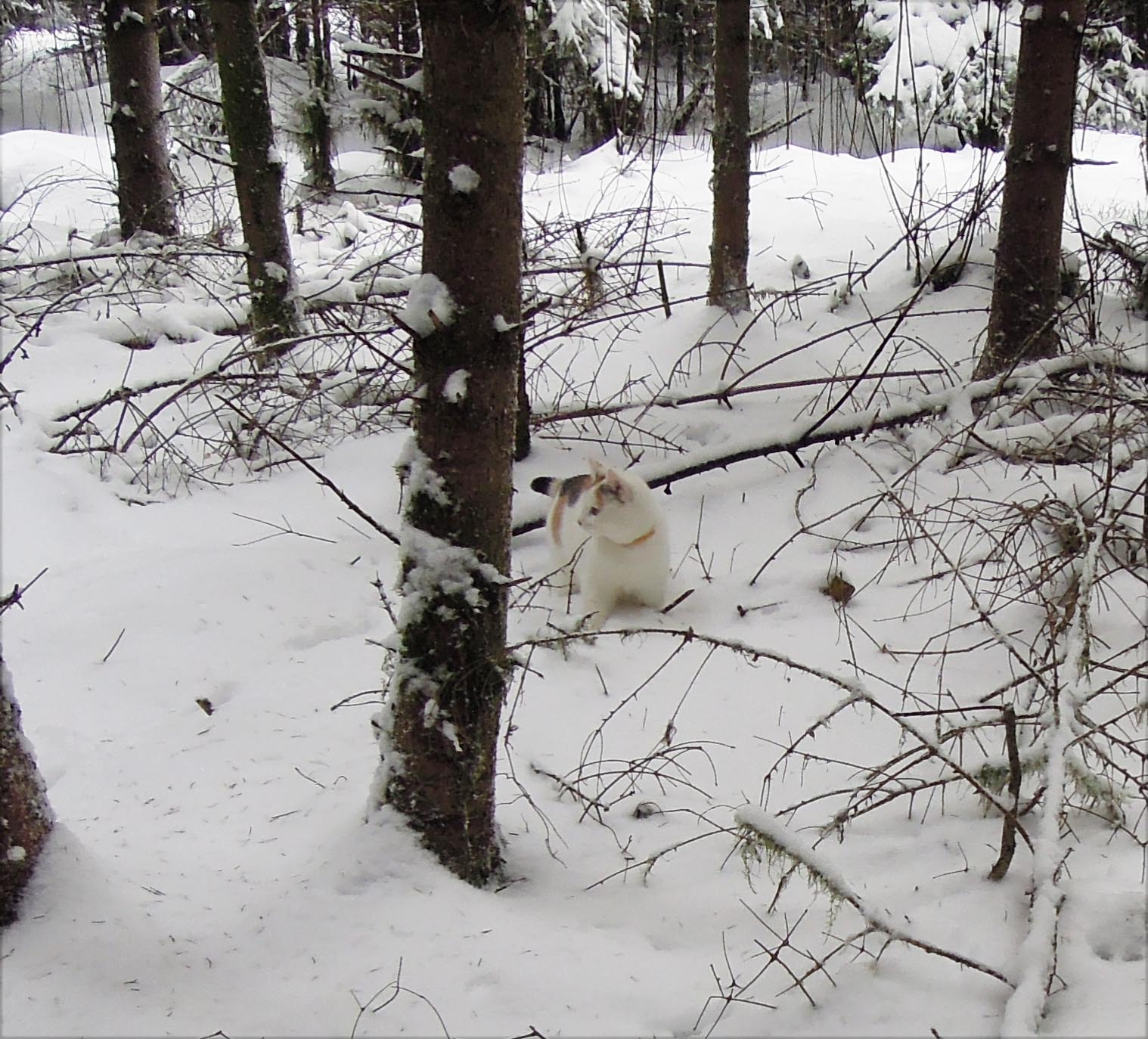 Three of my feline friends still accompany me, braving the cold, on the daily walk through the forest. Linda is the most eager participant. She is now half a year old, bursting of energy, always on the move, jumping around, crawling into the underbrush, and sniffing everywhere. The other two courageous walkers are Princess Min Ki and Rosy, with 11 and 12 years already senior cat ladies. They feel a bit intimidated by the young vital cat but Linda is making everything right, always being respectful and friendly to her fellow cats.