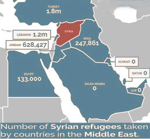 The rich Gulf monarchies Saudi Arabia, UAE, Qatar, Kuwait, and Bahrain, main perpetrators of the criminal aggression against Syria, have only taken dismal numbers of Syrian refugee, because the idea of thousands of foreigners coming in, without employment or any definite return date, is deeply uncomfortable for Gulf states.