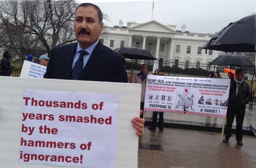It is recalled that the looting following the United States-led 2003 invasion of Iraq involved organized international gangs, sometimes with corrupt “Operation Iraqi Freedom” coalition military personnel involved that were contracted to raid the National Museum in Baghdad and Mosul Museum. Mosul Museum director Bernadette Hanna-Metti and Mosul Museum curator Saba al-Omari reported that radio carrying looters also targeted specific antiquities at Nimrud, some with “shopping lists” in hand. Site director Muzahim Mahmud reported that the looters “ignored everything else, went right to that frieze” of a winged man carrying a sponge and a holy plant, “and took it” in a customized looting operation, fulfilling “orders from a buyer.”