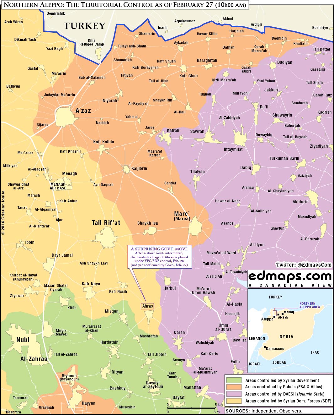 Syrian forces are within 8 kilometers of completing the encirclement of Aleppo’s rebel held districts, The Castello Road, last lifeline of the Islamists in eastern Aleppo districts, has repeatedly been closed by the Kurds in Sheikh Maqsoud. The FSA brigades in eastern Aleppo have been put under Ahrar al-Sham/Jabhat al-Nusra command.