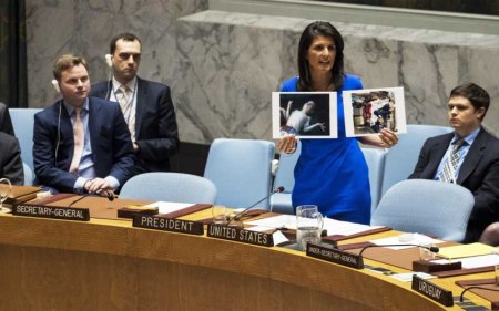 “Time and time again Russia uses the same false narrative to deflect attention from their ally in Damascus,” she said during a heated UN Security Council debate in New York, and hinting at possible unilateral action by the US, she added: “When the United Nations consistently fails in its duty to act collectively, there are times in the life of states that we are compelled to take our own action.”