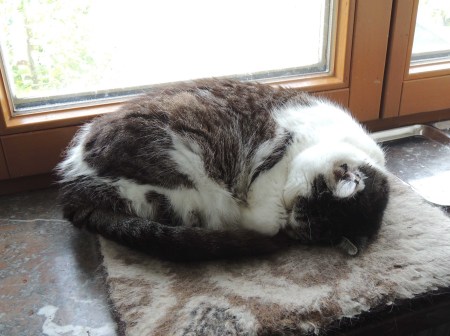 Suddenly, at 5 PM Wendy unceremoniously reappeared and now everything is good again. She was not even wet and I wonder where she did hide. At the moment she sleeps on one of my used T-shirts (always a favorite cat resting place). She got special food and special attention, which is of course counter productive because it could prompt her to occasionally stay away longer in order to get the special treatment.