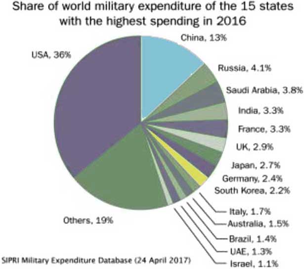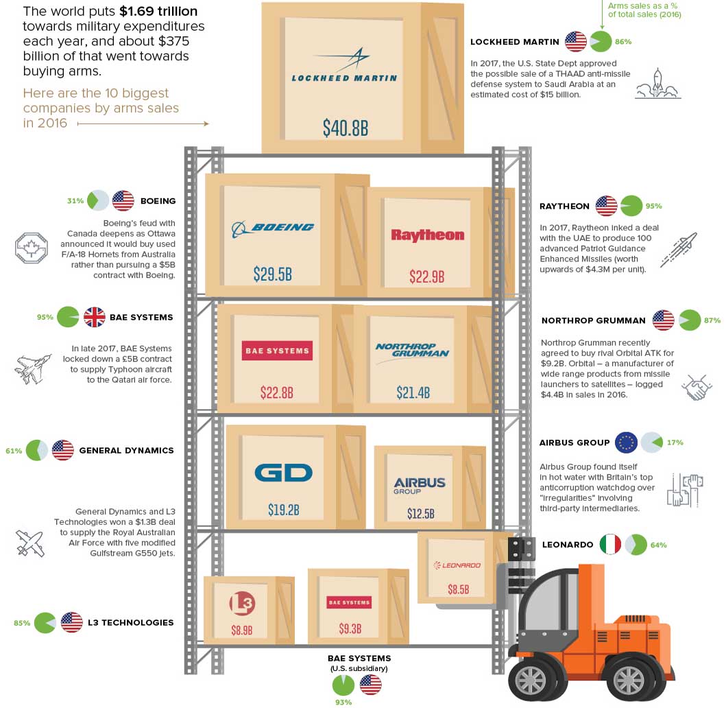 The USA accounts for 58 percent of the global arms trade (217 billion US$ worth). Saudi Arabia has agreed to buy precision guided munitions for 7 billion US$ from US companies. Raytheon and Boeing will primarily benefit from the deal that is part of a 110 billion US$ weapons agreement coinciding with President Donald Trump’s visit to Saudi Arabia in May 2017.