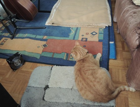 The cats are fine, only a bit dazed by the heat. Some of the cats and I slept for a few days in the cellar where it is still pleasantly cool. Gandhi Jr. got his own fan from my collection of industry parts and he really appreciated it.