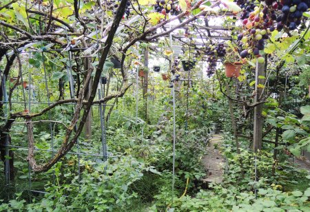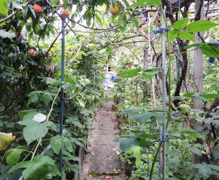 Since years I have prepared the garden for hot summers with protracted heatwaves. There is no lawn or meadow and at least half of the garden is covered by a tight canopy of leaves. More than 30 fruit trees, 18 grape vines, hundreds of berry bushes, and high growing herbs like mint, lemon balm, nettle, and sage protect the soil from sunlight. The vines climb on trellises, blackberry bushes don’t climb but they are tied to posts or trellises and together with the vines and fruit trees form arcades through which one can walk completely shielded from the sun.
