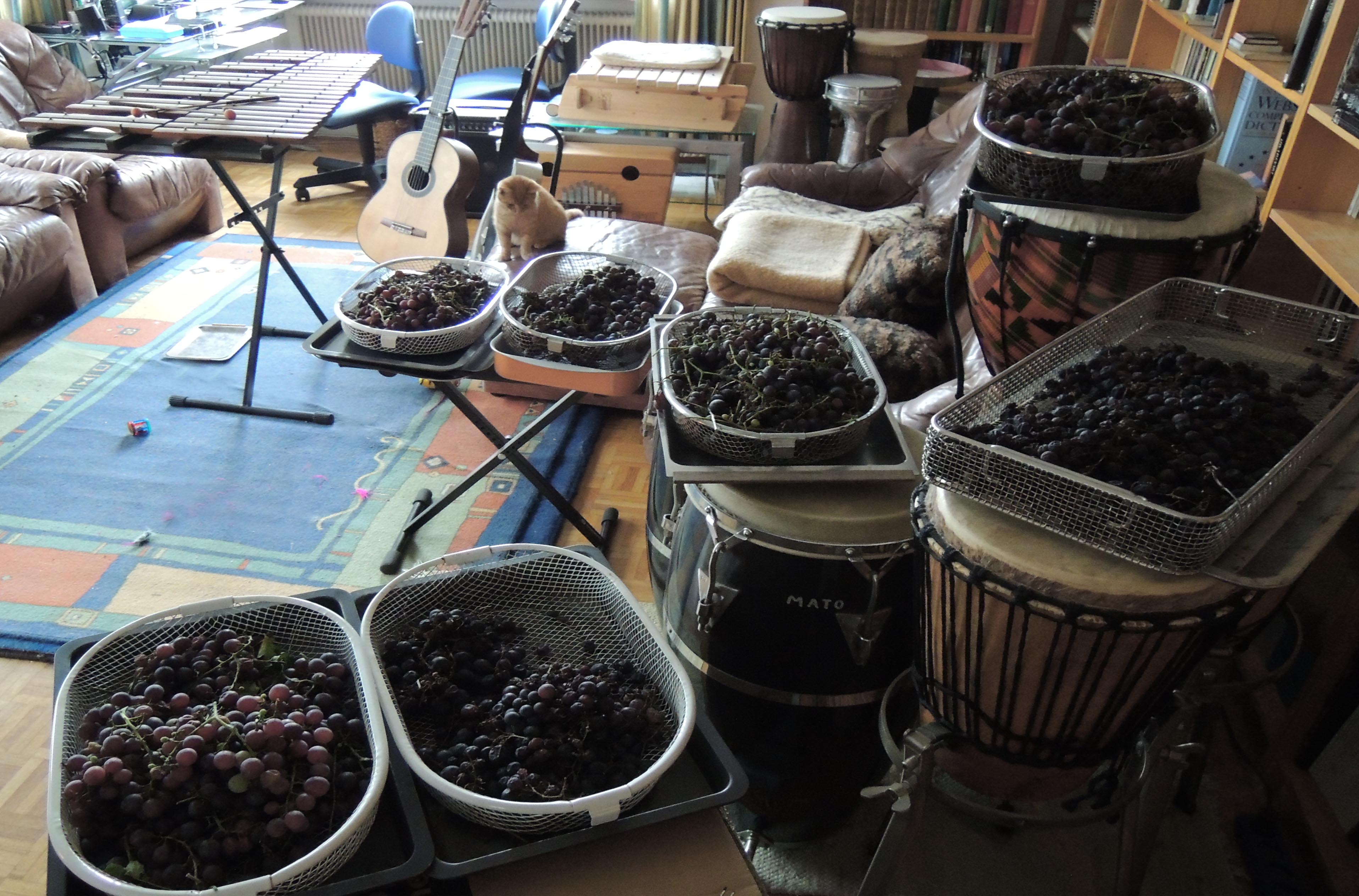 Yesterday I harvested the last grapes. A good part of them are not completely ripe and therefore sour, but as the season progresses and it most likely will not be warm and sunny enough anymore to let them ripe completely I finally put them in. I will mix the sour grapes with apples and canned berries to form together with rolled oats, cacao powder, and herbal tea my kind of muesli.
