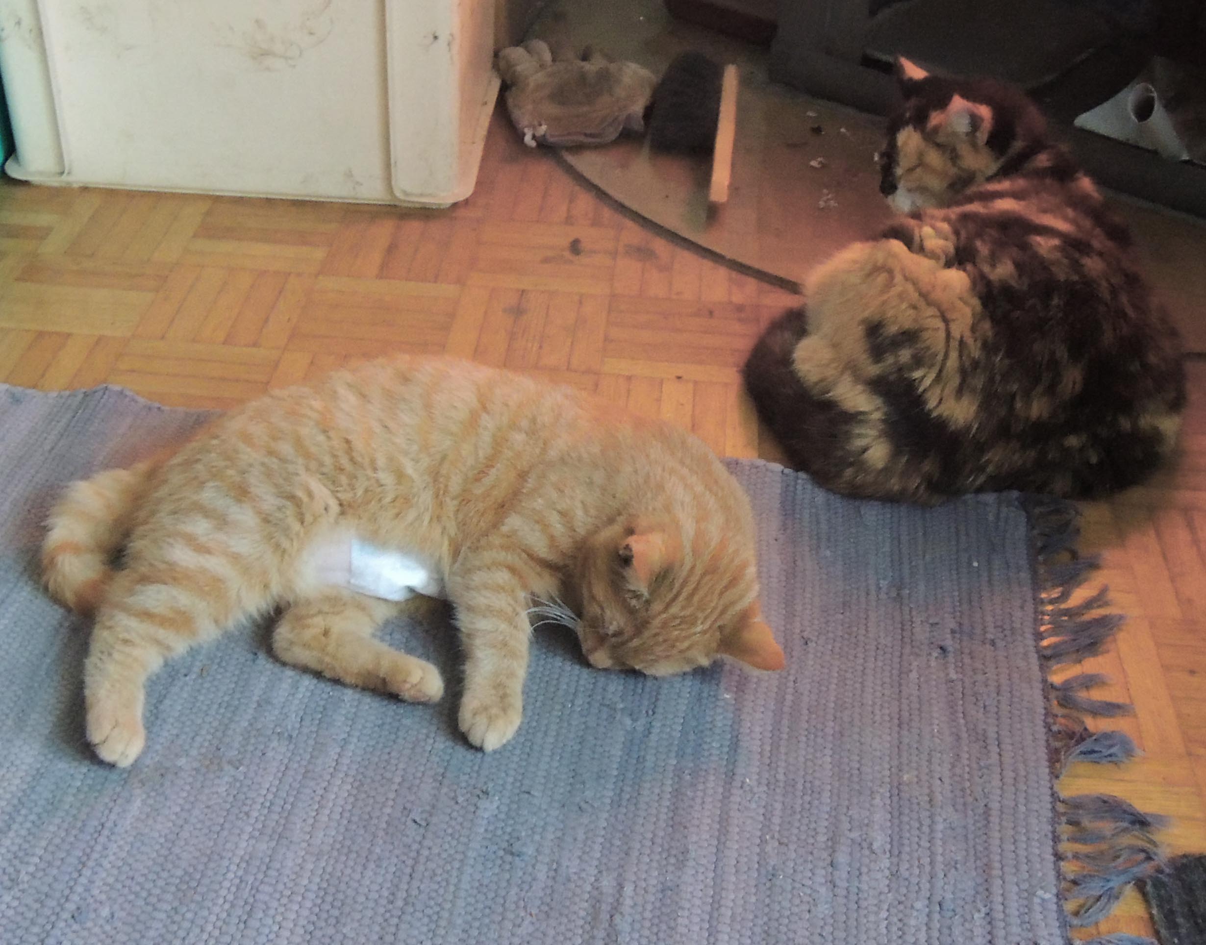 Rita got spayed. A feral tomcat was straying around the house and though Rita was still resisting it would have been only a few days for her to get into heat (estrus). The veterinarian performed the least invasive surgery, only removing the ovaries.