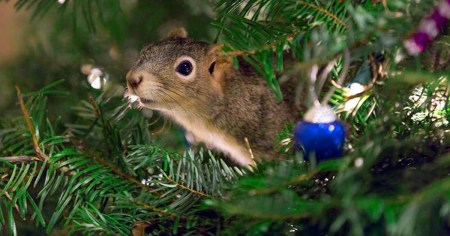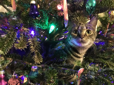 That critter hiding in the christmas tree is a rodent! Do your cats keep him/her as a pet? My old cats mostly ignore rats but now and then there is evidence of a carnage.