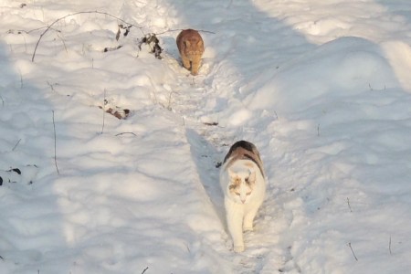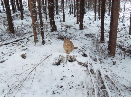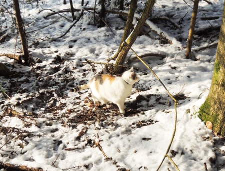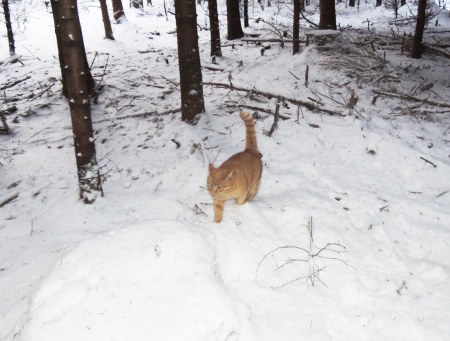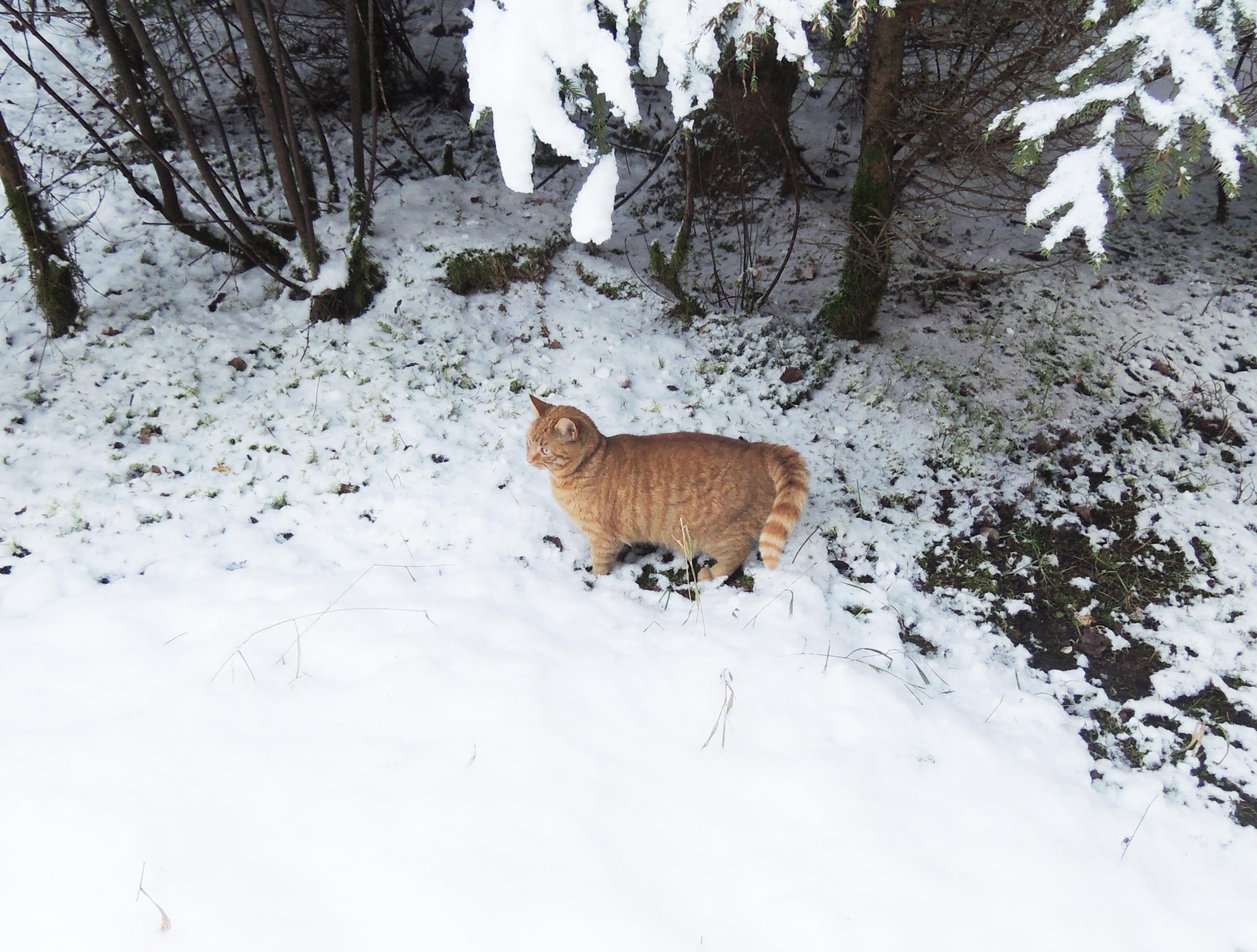 Rita is excited by the snow. It’s the first significant snowfall since years and also the first time Rita sees the land blanketed by a thick layer of snow. I had to plough a little pathway into the forest with my boots to make access easier for the cats, but under the trees the snow layer is less thick, as most of the snow is still on the branches. The cats nevertheless followed me in a line, jumping from one footprint to the next.
