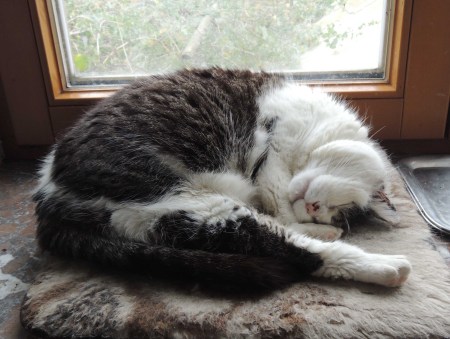 Not everybody will make it till next spring. Miss Marple’s skin cancer on her right ear and her nose suddenly started growing fast, it seemingly hurts and she is scratching, leaving bleeding wounds. She is getting deposit drug injections, mainly cortisone and antibiotics. Cortisone helps indeed, and for most of the time Miss Marple feels fine, purring constantly and snuggling against my hand and arm.