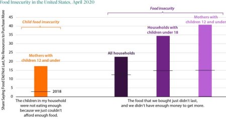 Results from two recent surveys show that by the end of April 2020, more than 20 percent of all US households and over 40 percent of mothers with children under the age of 13 were experiencing food insecurity. These figures are between two and five times greater than they were in 2018, when food insecurity data was last collected.