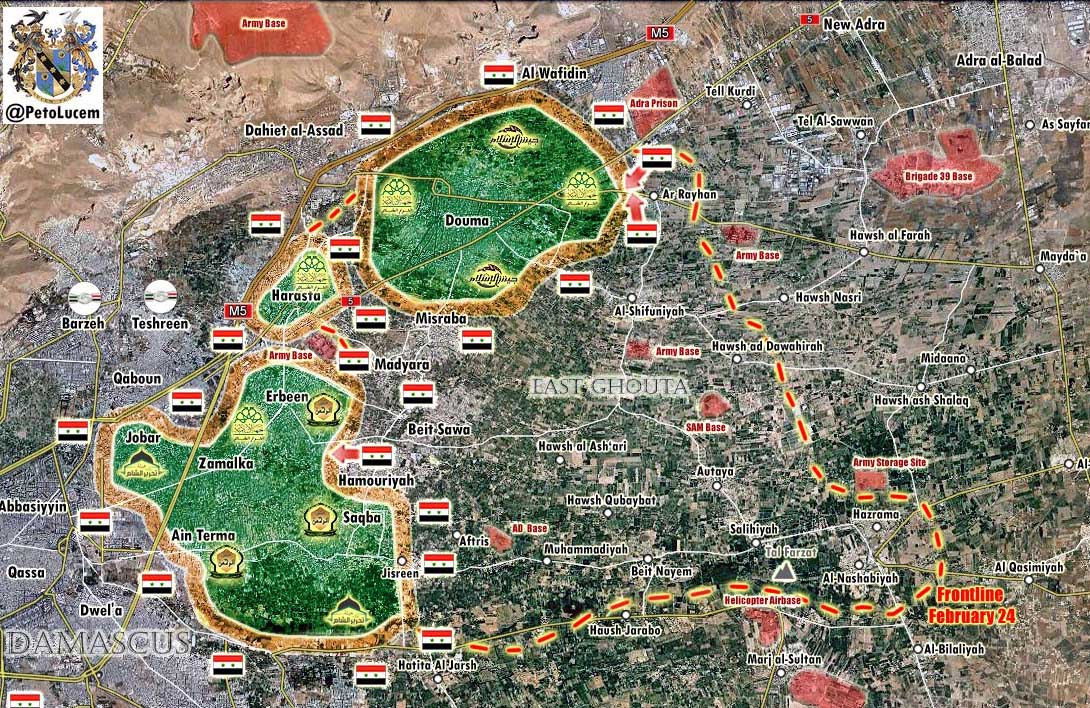 c. Jobar, Zamalka, Erbeen, controlled by Failaq al Rahman and Hayat Tahrir al-Sham (al-Qaeda affiliate al-Nusra). Ain Terma has just been cut off, as the army controls Wadi Ain Terma.