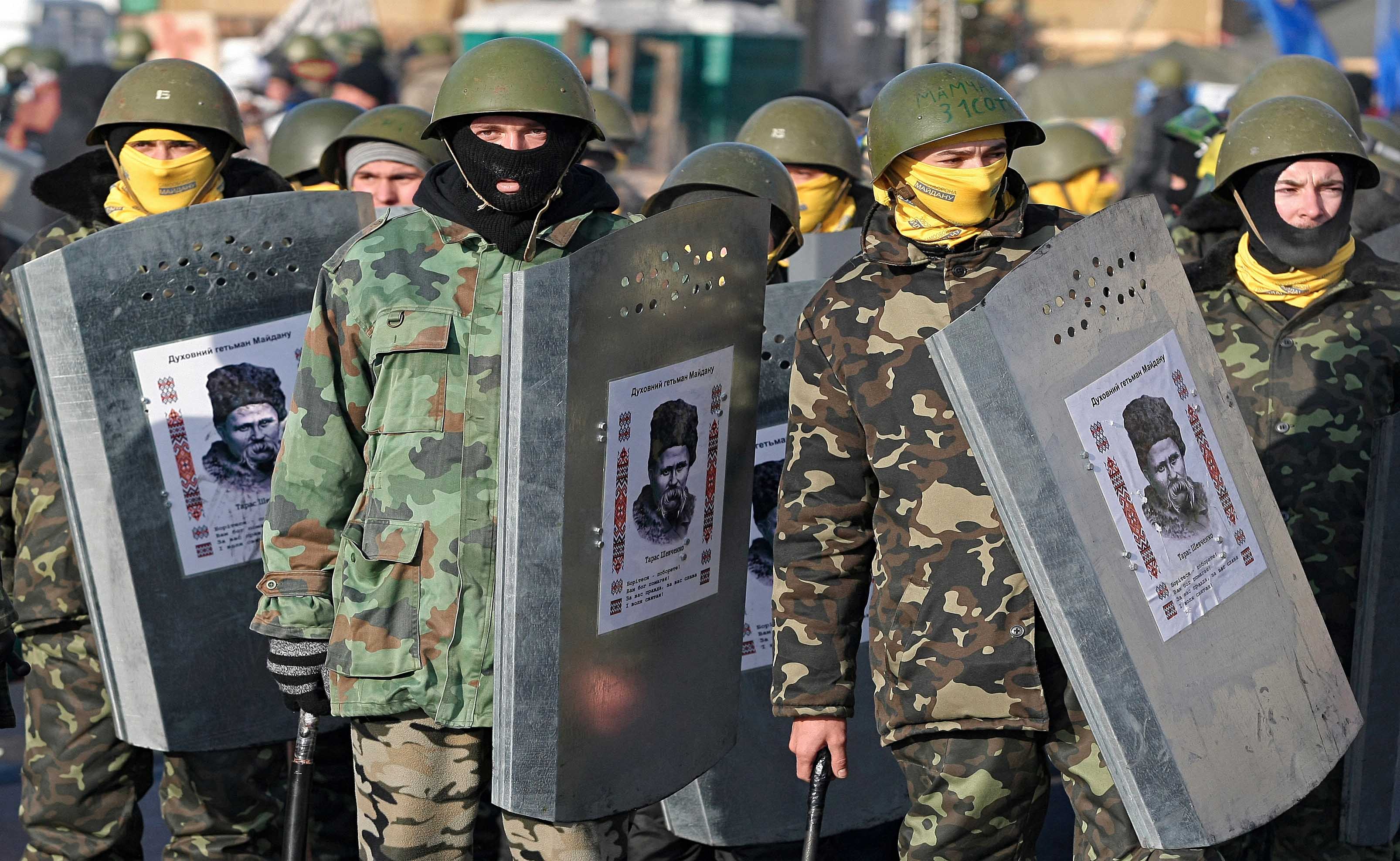 The Carpathian Sich is apparently a new formation that little is known about but the UNA-UNSO (Ukrainian National Assembly – Ukrainian National Defense) is a neo-Nazi organization. The “instruments” mean obviously weapons and other tools (shields, helmets, etc).