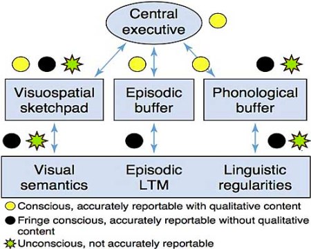 Working memory, also known as ultra short memory, central executive, or rich club, is involved in most of our everyday activities, such as preparing one’s own contribution to a debate while following the other discussants and incorporating their arguments. Working memory apparently is intricately interwoven with conscious awareness, though some studies suggest, that there are also unconscious activities (visual masking and attentional blink paradigms). If these studies were right, consciousness would nevertheless be a subset of working memory. There is also a theory, that the episodic buffer is the main place where conscious experience occurs.