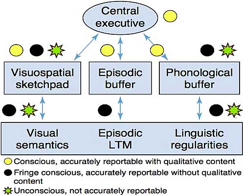 Working memory, also known as ultra short memory, central executive, or rich club, is involved in most of our everyday activities, such as preparing one’s own contribution to a debate while following the other discussants and incorporating their arguments. Working memory apparently is intricately interwoven with conscious awareness, though some studies suggest, that there are also unconscious activities (visual masking and attentional blink paradigms). If these studies were right, consciousness would nevertheless be a subset of working memory. There is also a theory, that the episodic buffer is the main place where conscious experience occurs.