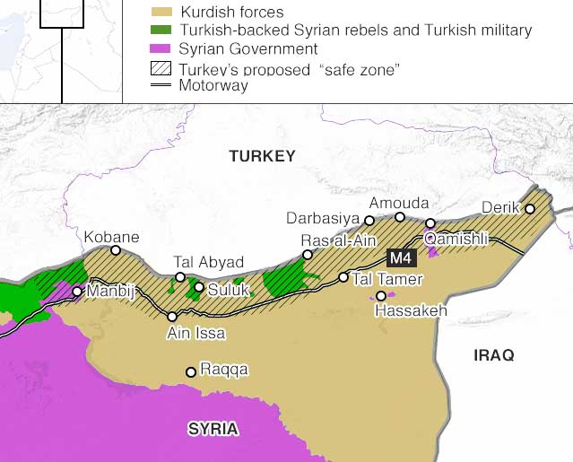 Turkey has drawn out a detailed plan for resettling two million Syrian refugees in the safe zone and many are concerned that once Turkish loyalists have resettled on Turkey’s border, Ankara will claim ownership of Syria’s northern region. The plan would cost roughly 27 billion US$ and Turkey has asked for other nations to grant funds to carry out its plan (good luck with that).