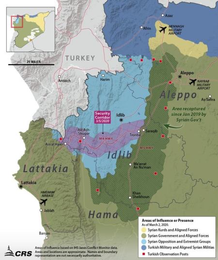 HTS (Hayat Tahrir al-Sham, formerly al-Qaeda affiliate al-Nusra) is also not mentioned and therefore excluded from the ceasefire deal. HTS doesn’t want to adhere to it anyway, so fighting will continue and after an appropriate time of abiding by the ceasefire, the SAA will launch a new offensive, citing Turkey’s failure to root out HTS from the area, frequent attacks by HTS on SAA positions, and continuing drone attacks on Russia’s Hmeimim air base.