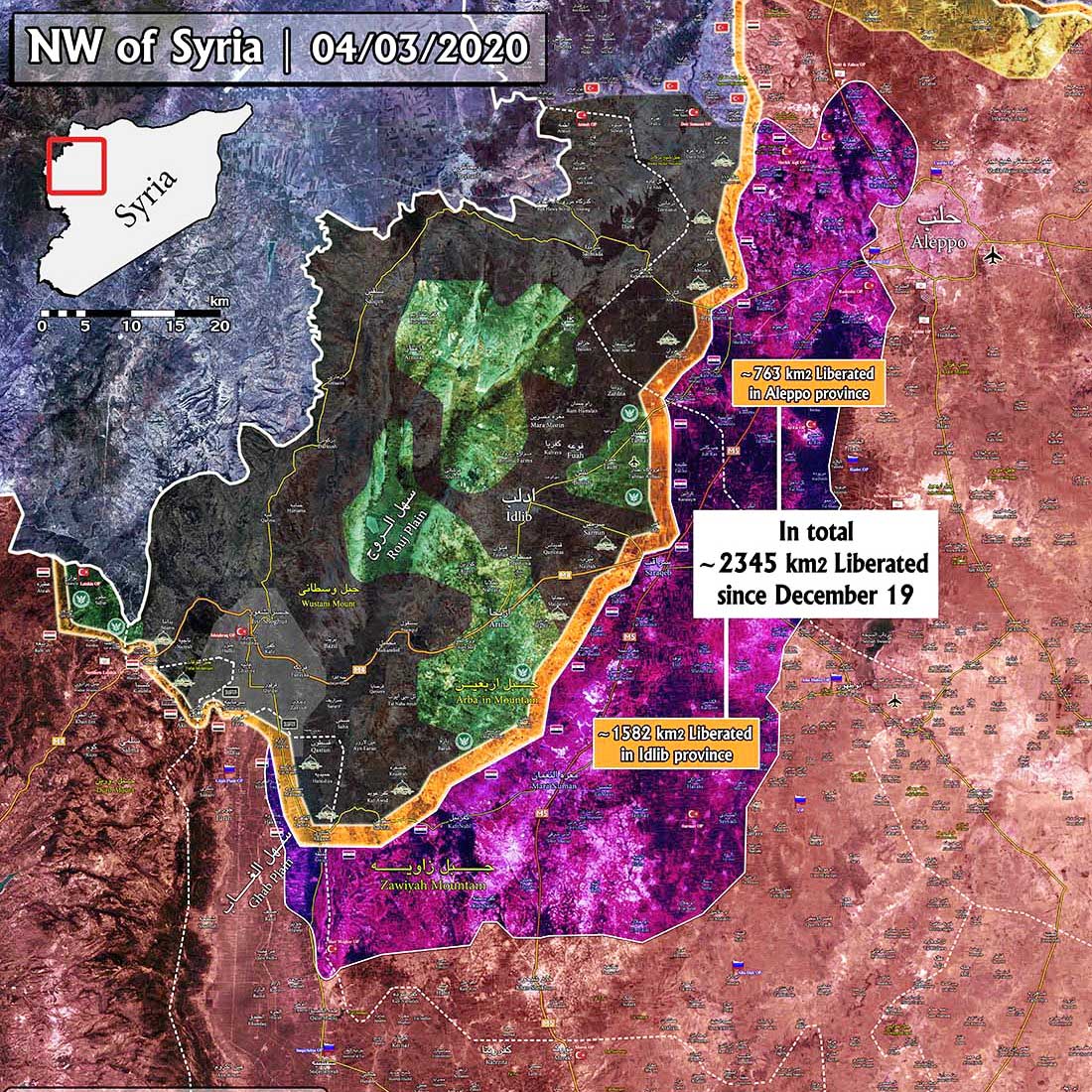 The initial Syrian army operation “Dawn of Idlib” from May to August 2019 resulted in the capture of the southern towns Kafr Nabudah, Qalaat al-Madiq, al-Habit, Kafr Zita, Al-Lataminah, Morek, and Khan Sheykhun. The army tried to outflank and encircle Islamic strongholds. There was heavy resistance and numerous suicide attacks by HTS (Hayat Tahrir al-Sham, the rebranded al-Qaeda affiliate). Four ceasefires failed and were used by the Islamists to launch counteroffensives.