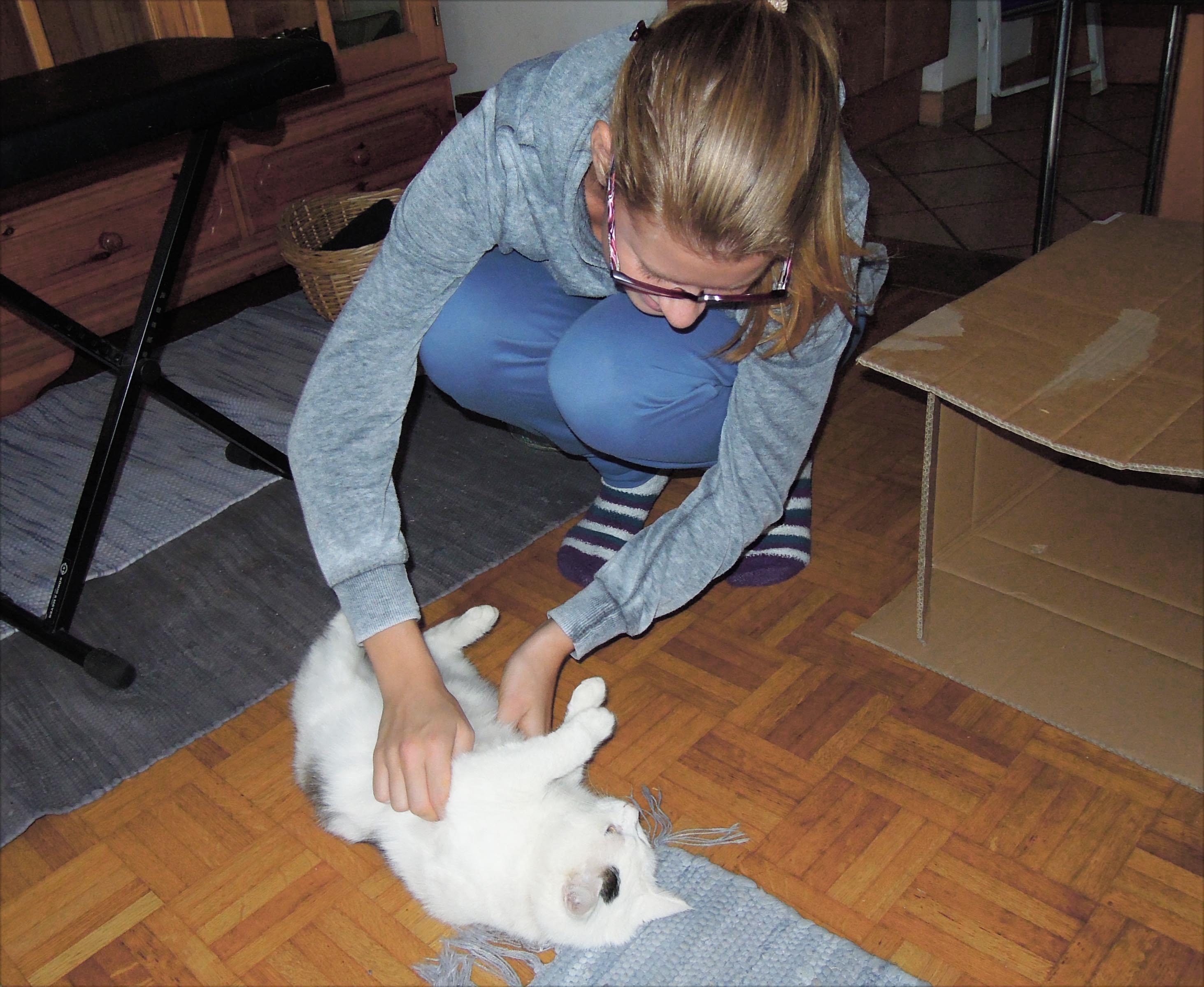 All the cats love to lay on cloth (jackets, pullovers, turtleneck sweaters, etc.) which I have put off. I always have to orderly hang up my cloth because otherwise it will be unavailable for a while. Yet, for Miss Marple I have to reserve a piece of cloth because she really needs it to feel comfortable. If I put a pullover beside her she will grab a sleeve and press it to her face and she will start purring.